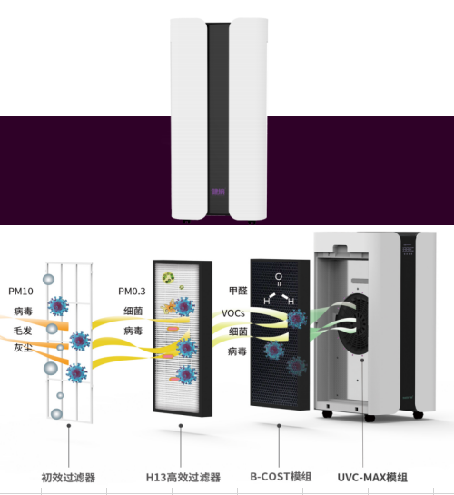 高效濾網(wǎng)、紫外線、B-COST專利觸媒消毒模塊,分體安裝,靈活布局,可以持續(xù)為室內(nèi)輸入經(jīng)過凈化消毒的空氣。